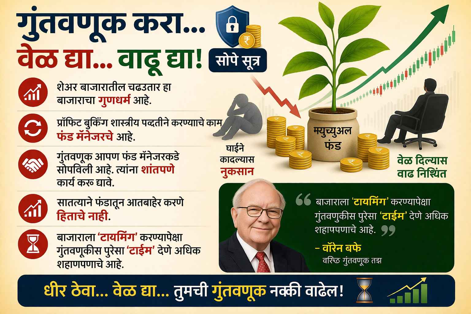 शेअर बाजारातील चढउतार हा बाजाराचा गुणधर्म आहे. प्रॉफीट बुकींग शास्त्रीय पद्धतीने करण्याचे काम फंड मॅनेजरचे आहे. गुंतवणूक आपण फंड मॅनेजरकडे सोपविली आहे. त्यांस शांतपणे कार्य करू द्यावे. सातत्याने फंडातून आतबाहेर करणे हिताचे नाही. याप्रसंगी वरिष्ठ गुंतवणूक तज्ञ वॉरेन बफे यांचे विधान महत्त्वाचे आहे, 'बाजाराला 'टायमिंग' करण्यापेक्षा गुंतवणुकीस पुरेसा 'टाईम' देणे अधिक शहाणपणाचे आहे'.